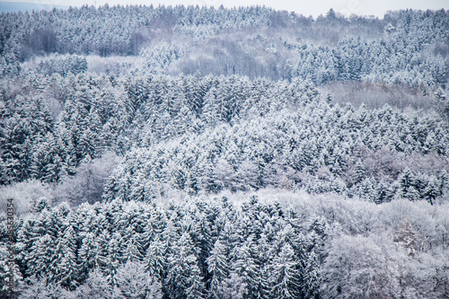 © Frobra, Fototapeta premium Hintergrundbild viele Tannenarten mit Schnee