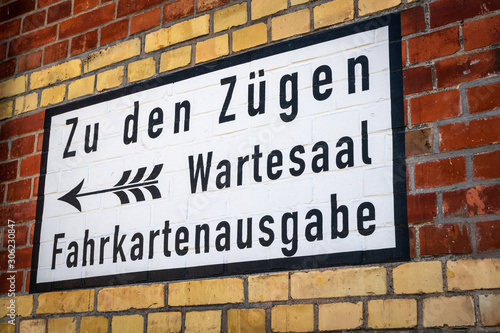 © dreamcatcher, Fototapeta premium Hinweisschild auf Backsteinwand gemalt im Bahnhof, historisch, retro