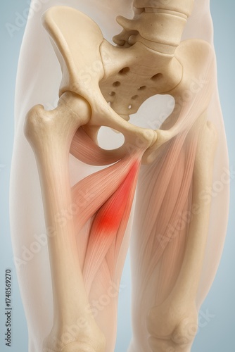 Naklejka premium Hip and pelvic injury medical illustration showing adductor strain with visible adductor longus attachment to pubis, concept of groin strain, inner thigh pain, anatomy of adductor muscle injury