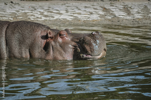 © elaralphoto, Fototapeta premium Hipopótamo dentro de estanque en cautiverio con mirada tranquila y triste