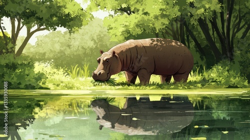 © lestari, Fototapeta premium Hippo Grazing by Pond in Lush Forest