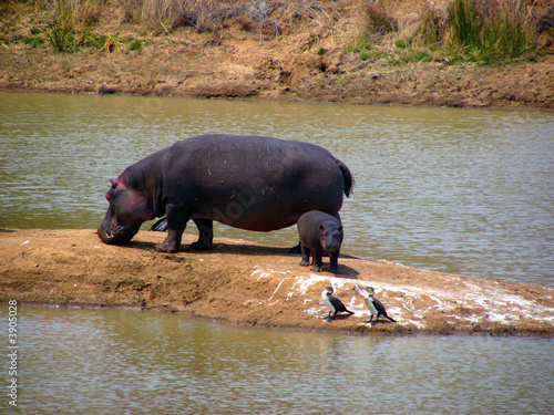 © Elzbieta Sekowska, Fototapeta premium Hippo with a baby on the islet