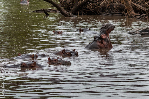 Obraz premium Hippo with open muzzle in the water. African Hippopotamus, Hippopotamus...