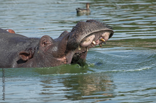 © leonidp, Fototapeta premium Hippopotamus displaying his teeth in the water with his mouth open wid