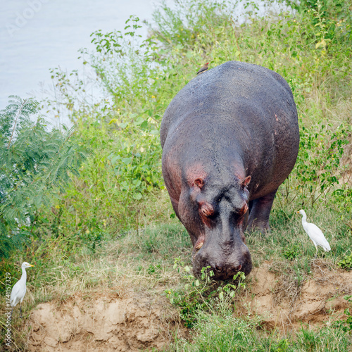 Fototapeta premium Hippopotamus grazing along water with cattle egret in Kruger National park,...
