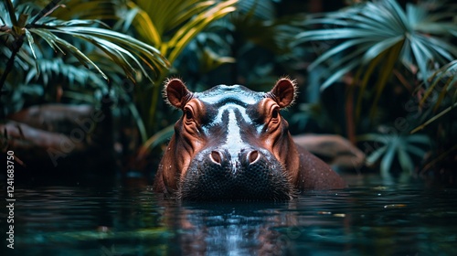 Fototapeta premium Hippopotamus in lush tropical foliage, wildlife habitat