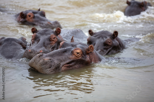 Fototapeta premium Hippopotamus in the water, hippos family swimming in the river, National...