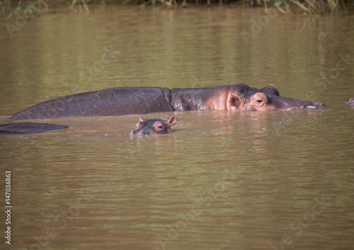 Fototapeta premium Hippopotamus mother with her baby in the water at the ISimangaliso Wetland...