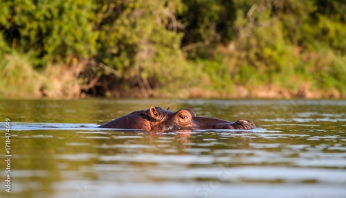 © Likah, Fototapeta premium Hippopotamus partially submerged in calm water