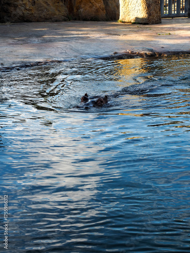 © Emilia, Fototapeta premium Hippopotamus swimming in clear water in zoo enclosure