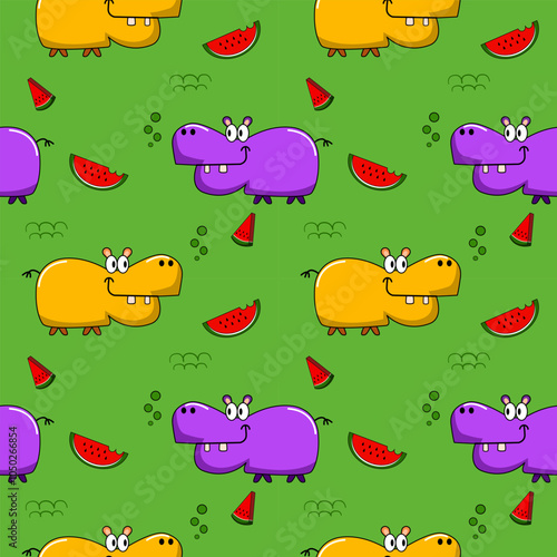 © Therdsak, Fototapeta premium Hippopotamus yellow purple cartoon so cute eat watermelon.on green background.pattern seamless vector and illustration.
