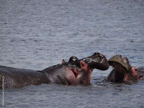 © Adventuring Dave, Fototapeta premium Hippos face to face with mouths open wide
