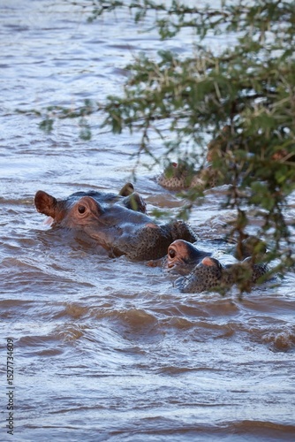 © Wirestock, Fototapeta premium Hippos in a Muddy River