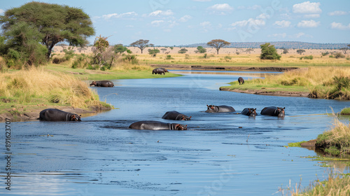 © niwat, Fototapeta premium Hippos in a water hole