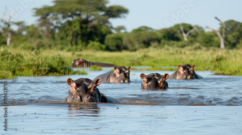 © niwat, Fototapeta premium Hippos in a water hole