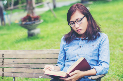 © chaunpis, Obraz premium Hipster charming girl relaxing in the park while read book, Enjo