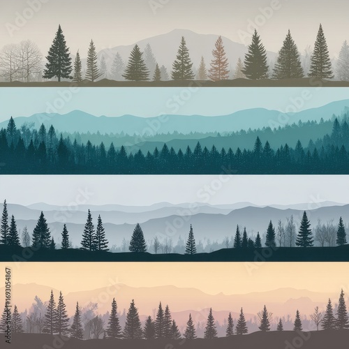 © Olena, Obraz premium Hipster Flat Horizon with Linear Mountains and Coniferous Forest in a Foggy Background