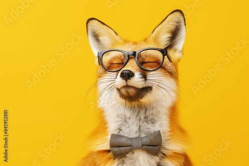 © Татьяна Евдокимова, Fototapeta premium Hipster fox grooving with closed eyes, sporting glasses and a bowtie against a vibrant yellow backdrop, exuding charm and cool vibes