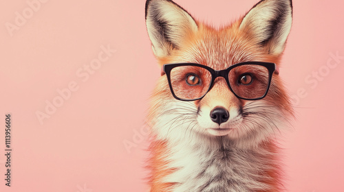 © Anna, Obraz premium Hipster fox in stylish black glasses on pink pastel background