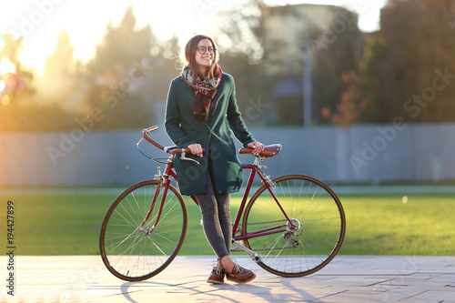 © Oleksandr Kozak, Obraz premium Hipster girl with vintage bicycle