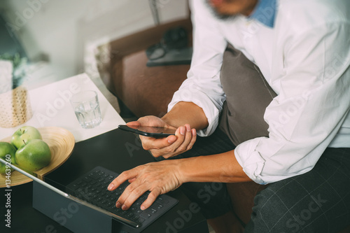 Obraz premium hipster hand using digital tablet docking keyboard and mobile pa