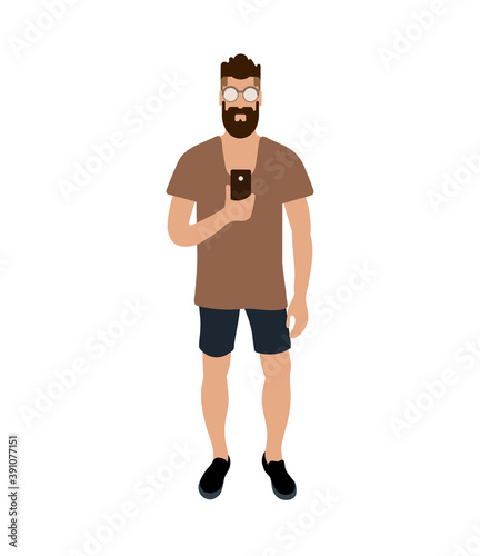 Fototapeta premium Hipster man making selfie. Cartoon character with beard in brown t-shirt and black shirts. EPS 10 Vector.