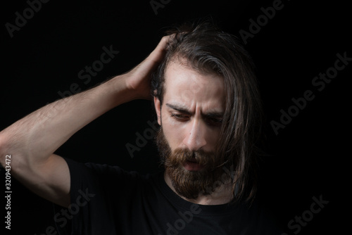© mahirkart, Fototapeta premium Hipster man solves a problem and thinks. Shot on black isolated background.