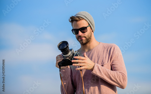 © be free, Obraz premium Hipster reporter taking photo. Guy photographer outdoors sky background. Handsome photographer guy retro camera. Manual settings. Photojournalist concept. Travel blogger. Professional photographer