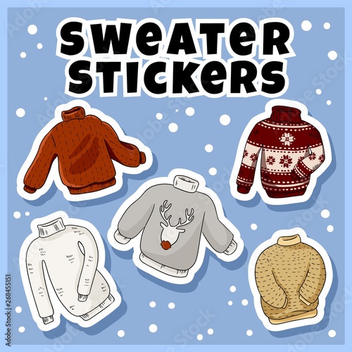 Naklejka premium Hipster sweaters stickers set. Collection of colorful doodles labels