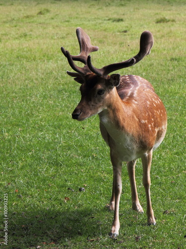 © Robert, Naklejka premium Hirsch auf grüner Wiese im Freigehege