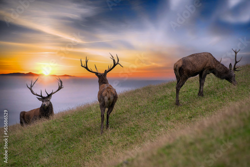 © GERHARD, Naklejka premium 3 Hirsche im Sonnenuntergang