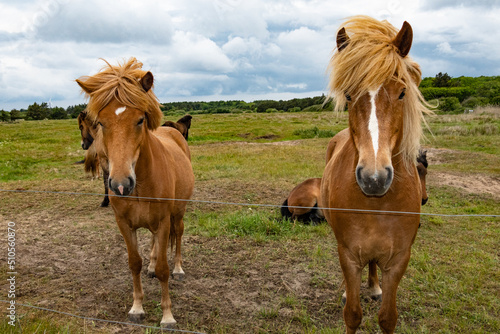 © Alexander, Fototapeta premium Hirtshals, Denmark Horses in a field behind a fence.