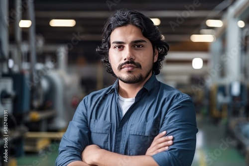 © Gelpi, Fototapeta premium Hispanic factory worker with safety gear and space for text. Generative AI