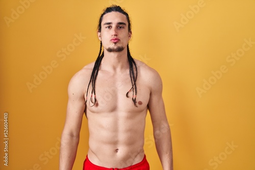 © Krakenimages.com, Fototapeta premium Hispanic man with long hair standing shirtless over yellow background looking at the camera blowing a kiss on air being lovely and sexy. love expression.