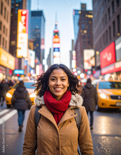 Fototapeta premium Hispanic woman in tan parka and red scarf smiling in Times Square