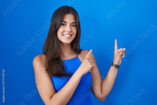 © Krakenimages.com, Fototapeta premium Hispanic woman standing over blue background smiling and looking at the camera pointing with two hands and fingers to the side.