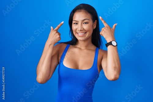 Fototapeta premium Hispanic woman standing over blue background smiling pointing to head with...