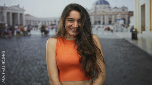 © Krakenimages.com, Fototapeta premium Hispanic woman touches hair while standing on crowded sunlit street outside vatican building; serenity calm peace tranquility.