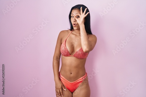 Naklejka premium Hispanic woman wearing bikini doing ok gesture shocked with surprised face,...