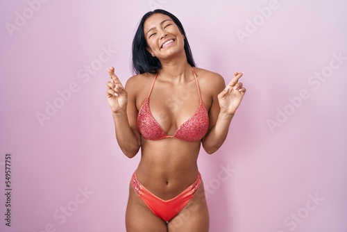 Obraz premium Hispanic woman wearing bikini gesturing finger crossed smiling with hope and...