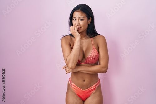 Obraz premium Hispanic woman wearing bikini looking stressed and nervous with hands on mouth biting nails. anxiety problem.