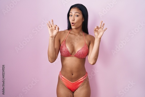 Naklejka premium Hispanic woman wearing bikini looking surprised and shocked doing ok approval symbol with fingers. crazy expression