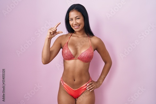 Obraz premium Hispanic woman wearing bikini smiling and confident gesturing with hand doing small size sign with fingers looking and the camera. measure concept.