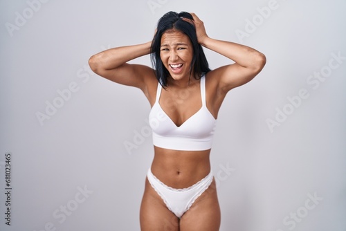 Fototapeta premium Hispanic woman wearing lingerie crazy and scared with hands on head, afraid...