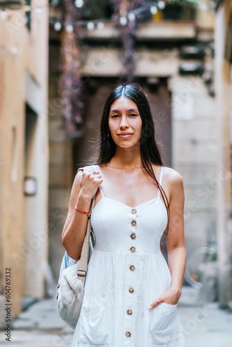 © dzmatph, Fototapeta premium Hispanic woman with backpack holding hand in pocket of white dress and looking at camera while standing on blurred background of street of Barcelona, Spain