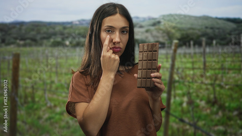 © Krakenimages.com, Naklejka premium Hispanic young brunette woman points index finger to cheek while holding a large chocolate bar in a forest vineyard; longing craving.