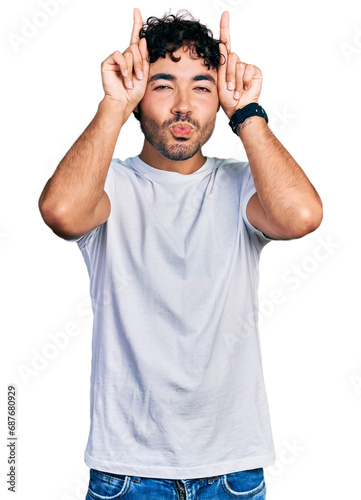 Naklejka premium Hispanic young man with beard wearing casual white t shirt doing funny gesture with finger over head as bull horns