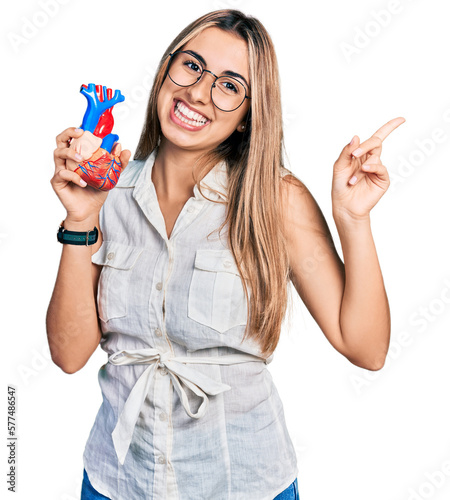 Obraz premium Hispanic young woman holding heart organ smiling happy pointing with hand and finger to the side