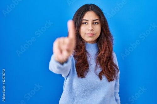 © Krakenimages.com, Fototapeta premium Hispanic young woman standing over blue background pointing with finger up and angry expression, showing no gesture