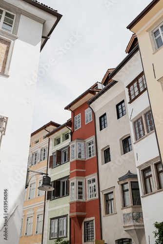 Fototapeta premium Historic architecture in Italy. Traditional European old town street buildings. Wooden windows, shutters and colourful pastel walls. Aesthetic summer vacation travel background